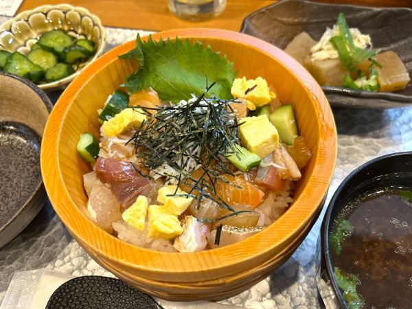 別の日には、数量限定に惹かれてしまい「きさいや水産の漬け丼御膳」をいただきました。炙りの鯛など、5種類の海鮮が入っていました。この日は、鯛の赤味噌のお味噌汁。前回同様、香りからたまらない一品です。
