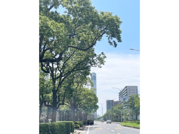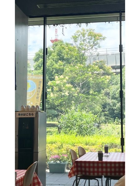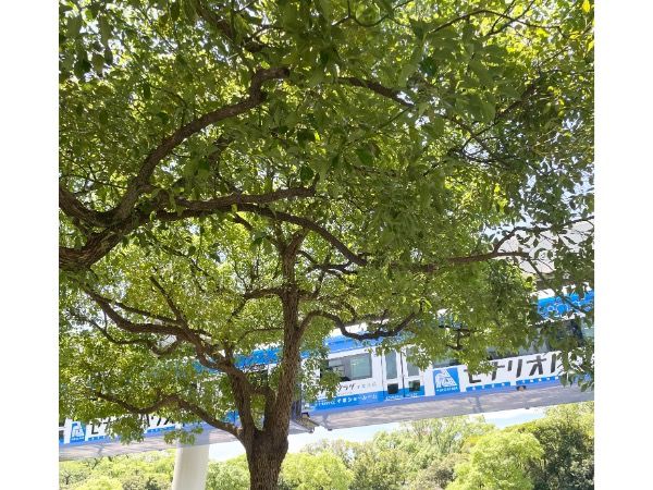 窓際のカウンター席から見えるのは、みなと公園の一面の緑。しかもモノレールも目の前を通る絶景です。