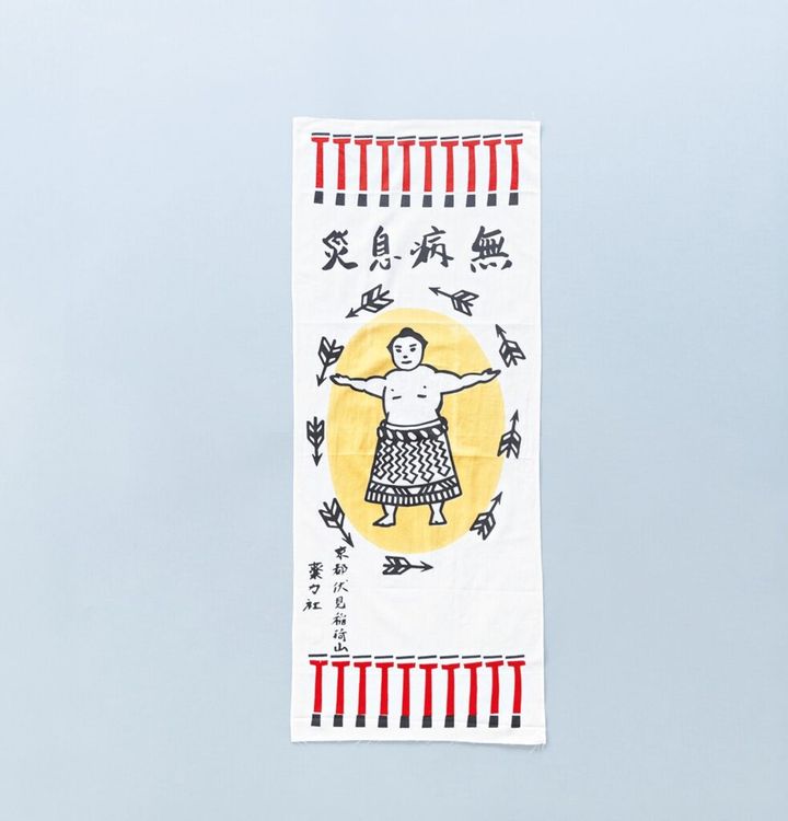伏見稲荷大社の御神体・稲荷山には、いくつもの神社やお塚があり、山頂近くで薬力大神を祀る薬力社もそのひとつ。無病息災や薬効で広く信仰を集めてきた薬の神様・薬力大神。門前の『薬力亭』は100年にわたり薬力社の塚守として授与品を取り扱い、稲荷山のお山めぐりの休憩所の役割を果たしてきた。体の丈夫な力士は古くからイメージキャラクターだという。力士の周りに描かれた9本の矢は、矢9=厄を祓う意味を込めている。注染手ぬぐい・薬力亭¥1,320。伏見区深草稲荷山官有地17 TEL:075・641・3846 8:00~17:00 不定休