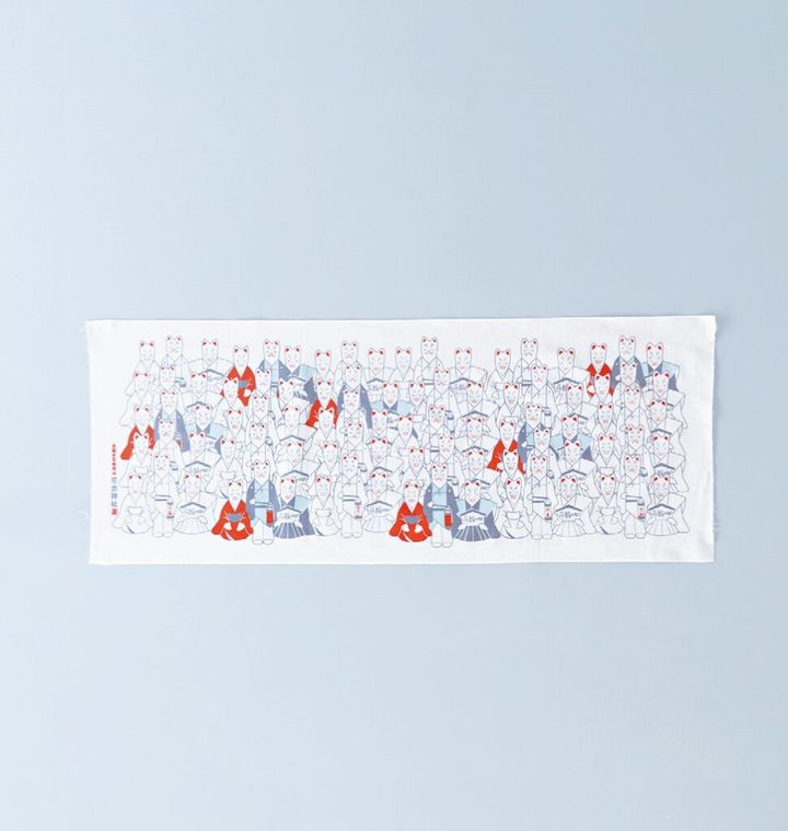 稲荷山の裏参道にある「荒木神社」は縁結びの神様。良縁や就職など、さまざまな縁を結んでくれるという。そのお参りの仕方はユニークで、夫婦と伴(=仲人)の3体がひと組になった口入人形を手に入れ、祈願したら持ち帰って家に祀り、願いが叶ったら神社に人形を奉納するというもの。伏見稲荷大社の神の使いが狐であることから口入人形も狐の姿。境内に口入人形がぎっしりと並ぶ姿は圧巻だ。手ぬぐいにもその様子が描かれている。口入人形手拭い¥800。伏見区深草開土口町12‐3 TEL:075・643・0651 参拝自由 授与所9:00~17:00 無休