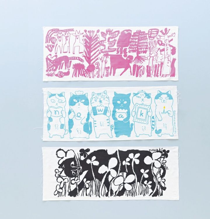 器と絵本を扱うギャラリーショップは、実は手ぬぐい探しに外せないスポットでもある。店主の好きが高じて、展覧会の際に作家たちとオリジナルを作っているのだ。注染という技法で染められた手ぬぐいは柔らかな風合い。裏までしっかり染められていて裏表なく使えるのも魅力。上から、ミロコマチコ手拭い「のわきとみろこ」、町田尚子手拭い「猫」、きくちちき手拭い。各¥1,650。左京区新丸太町49‐1 TEL:075・285・1595 11:00~19:00 水・木曜休、ほか不定休 来店はオンラインショップからの事前予約制