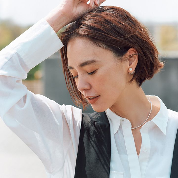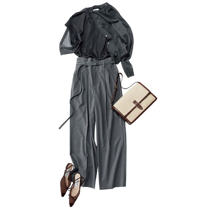 シアーや切れ味のいいクロップド丈で更新感を。マンネリになりがちな地味色オシャレをアップデートしてくれる主役級アイテムが豊富。 シアージャケット¥25,300Tシャツ¥9,900(ともにイウエン マトフ/ユナイテッドアローズ 渋谷スクランブルスクエア店)パンツ¥25,300(エンフォルド)バッグ¥27,900(トゥティエ)ピアス¥15,400(カラ・ユ/ショールーム ロイト)ブレスレット¥217,800(オー/ハルミ ショールーム)