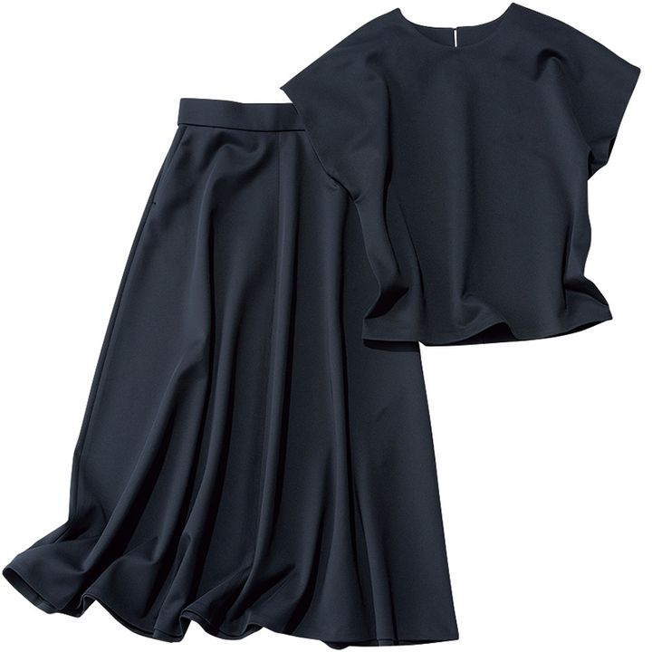 程よく肉厚で立体感のあるスキューバ素材。シワにならないのも心強い。 プルオーバー¥6,990スカート¥9,900(ともにプラステ)