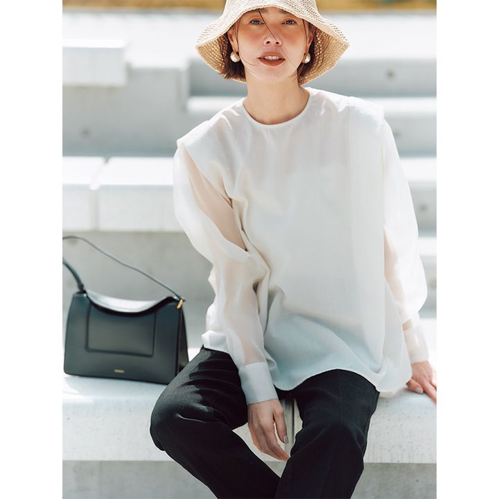 「コンサバで終わらないモード感がハンサム派にぴったり。夏らしい透け感を楽しめて、肩はしっかり隠れるのが秀逸。」 ブラウス¥9,900(マルゥ ユナイテッドアローズ/ユナイテッドアローズ カスタマーサービスデスク)パンツ¥13,000(プラステ)バッグ¥152,900(ワンドラー/ブルーベル・ジャパン)ピアス¥18,700(ニナ・エ・ジュール/ショールーム ロイト)ハット¥23,100(カラコラム アクセサリーズ/ロンハーマン)