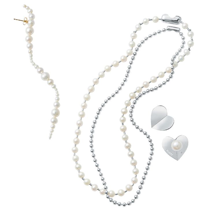 ピアス¥29,700(マッソーズアンドマッソーズ/ショールーム ロイト)ハートピアス¥18,700※片耳価格 シルバーネックレス¥17,600パールネックレス¥26,400(すべてマユ/マユ ショウルーム)