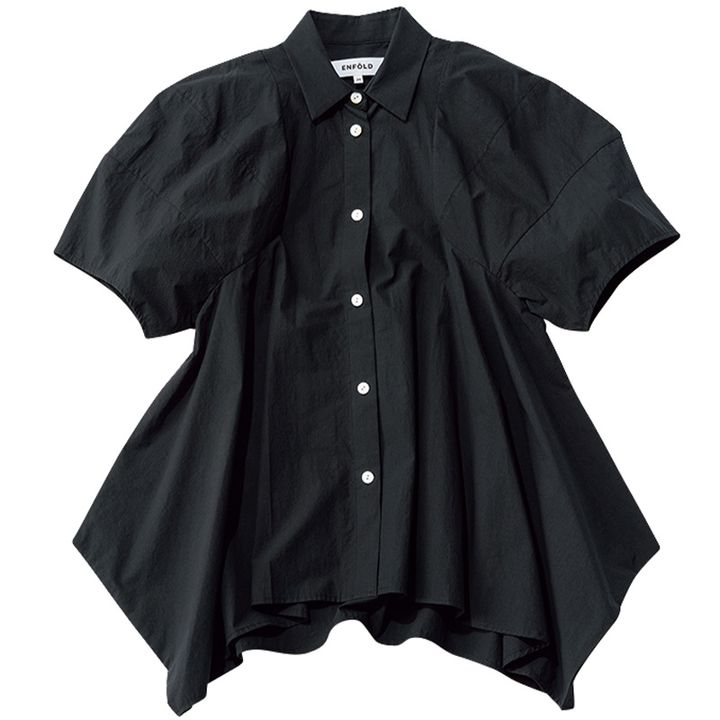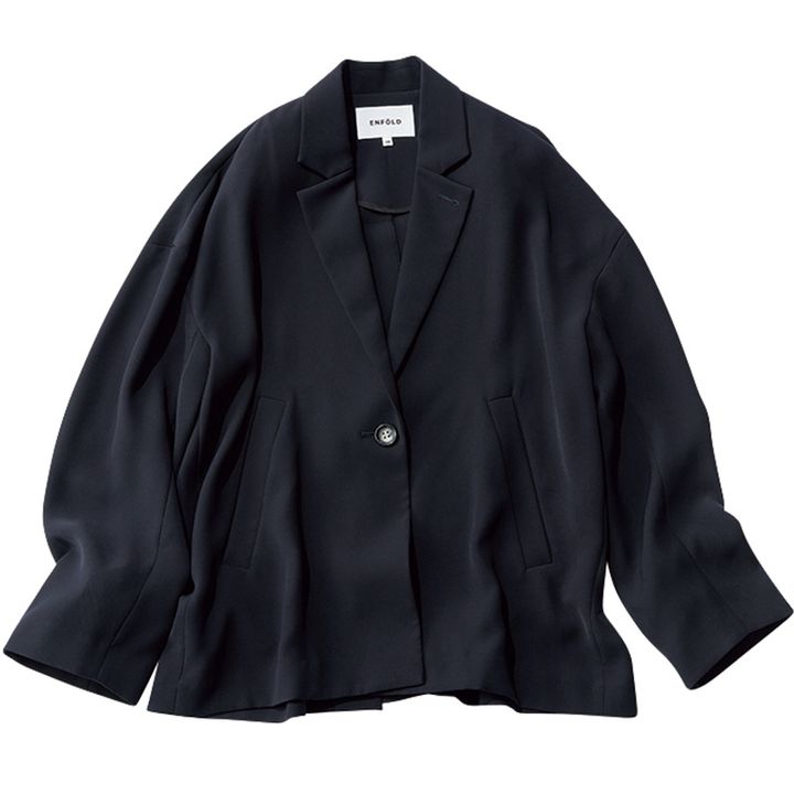 「行事の時にも頼れるエンフォルド、定番のツイル素材はイージーケアもうれしい。きちんとしてるけどゆるい、を叶えてくれる真面目すぎないジャケットや変形ブラウスを」