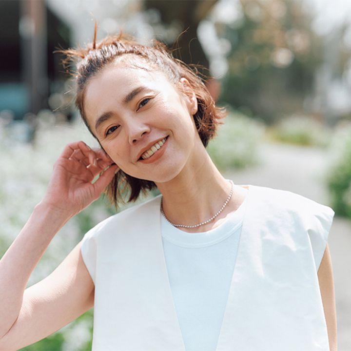 POINT① アクセも甘さ控えめ!パール見えできちんと顔なマユのシルバーボールネックレスを愛用。