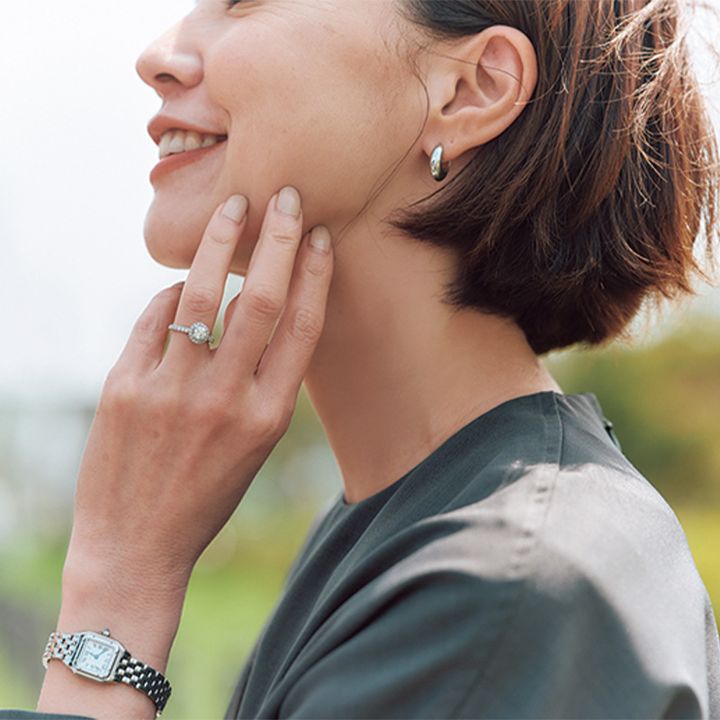 POINT① 婚約指輪にも選んだ、夫婦揃って最愛のジュエラー。地味色に映えるパンテールウォッチは最近贈られたもの。