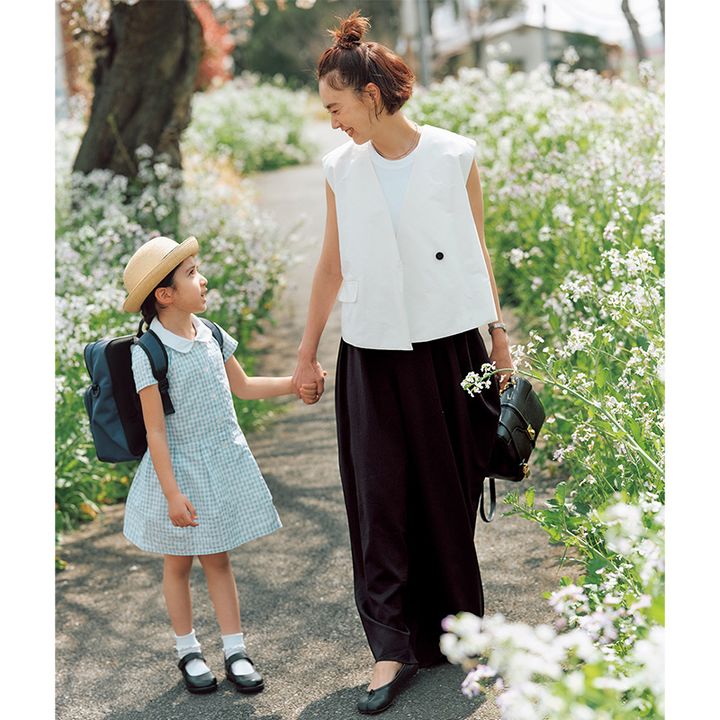 幼稚園に通う長女&保育園に通う長男とW送迎なので車や自転車が多く、毎日の送迎はそこまでキレイな格好はしていません(笑)。太パンツやタンクトップなどゆるいカジュアルがベース。気負わず羽織れるジレや、かっちりフォルムのバッグで印象を整えて完成。