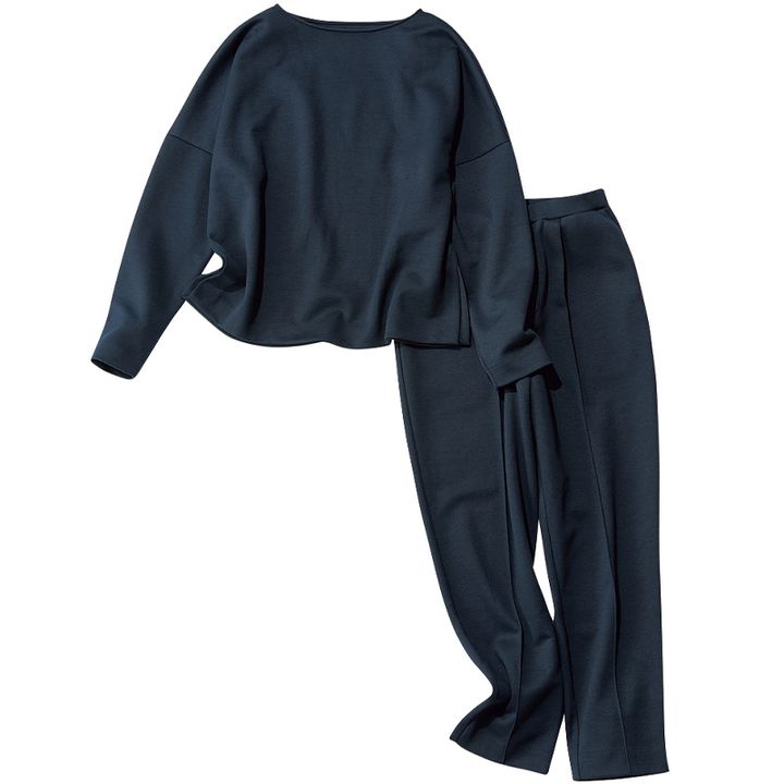 ライトジャージーでそのまま寝られそうな着心地と、センタープレスパンツできちんと感を両立。要望を受けて待望のネイビーが登場。 セットアップ¥22,000(WRAY)
