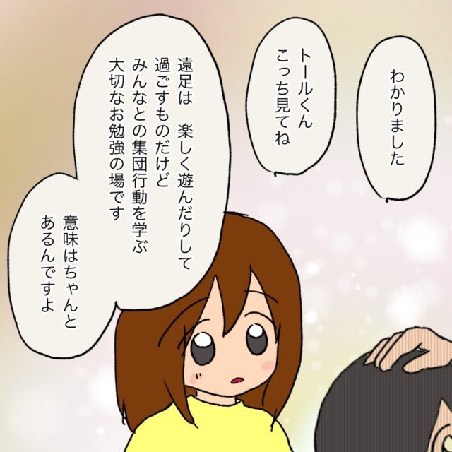 「トールくん、こっち見てね。遠足は、楽しく遊んだりして過ごすものだけど、みんなとの集団行動を学ぶ大切なお勉強の場です。意味はちゃんとあるのですよ」