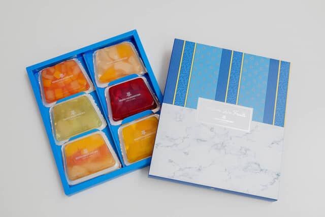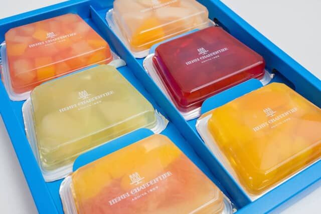 それぞれ2種類のフルーツがたっぷり入ったゼリーはテリーヌの形。アップル&イエローピーチ、グレープ&ポワール(洋なし)、オレンジ&グレープフルーツ、ピーチ&アプリコットと共に、新作はオレンジ&イエローピーチとマンゴー&アプリコットの2種が入っています。