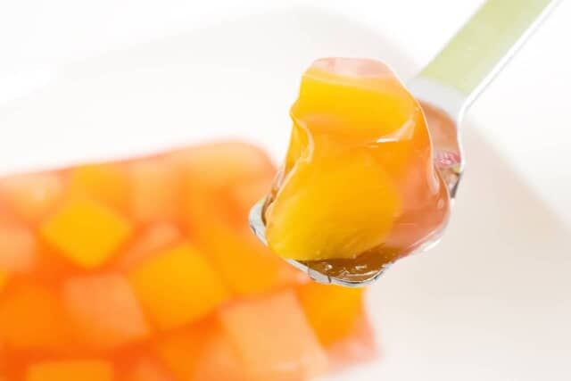 口に含むとフワリととろける爽やかな味のゼリーには、果実がたっぷり入ります。今回は2種類の新作、「オレンジ&イエローピーチ」と「マンゴー&アプリコット」が加わりました。