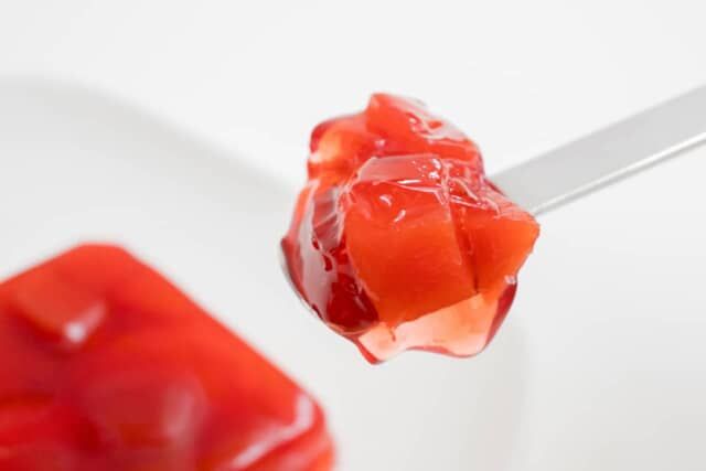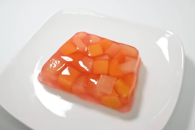 「オレンジ&イエローピーチ」は、真っ赤に染まったフランボワーズ(ラズベリー)のゼリーに、爽やかなオレンジと、まったりと甘いイエローピーチを閉じ込めています。