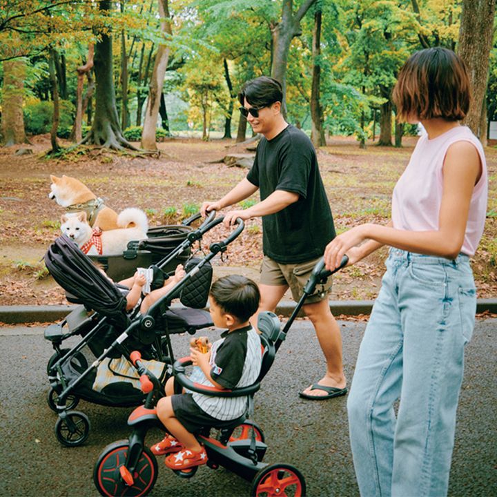 「自宅から公園までの少しの移動なら、3台まとめて目的地までビューンと運んじゃいます!おもちゃや着替えなどはベビーカーの荷物入れにイン」