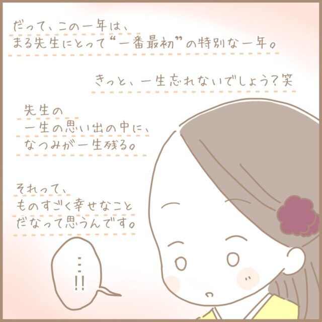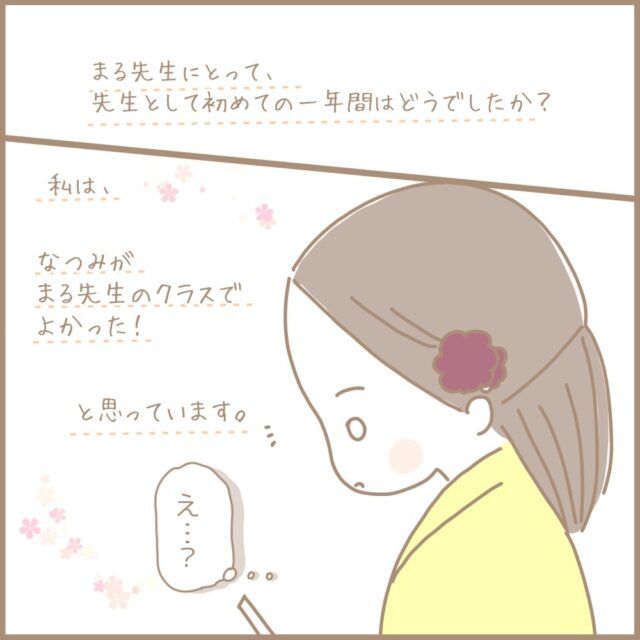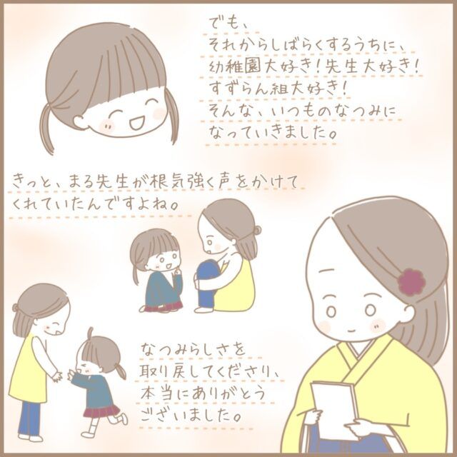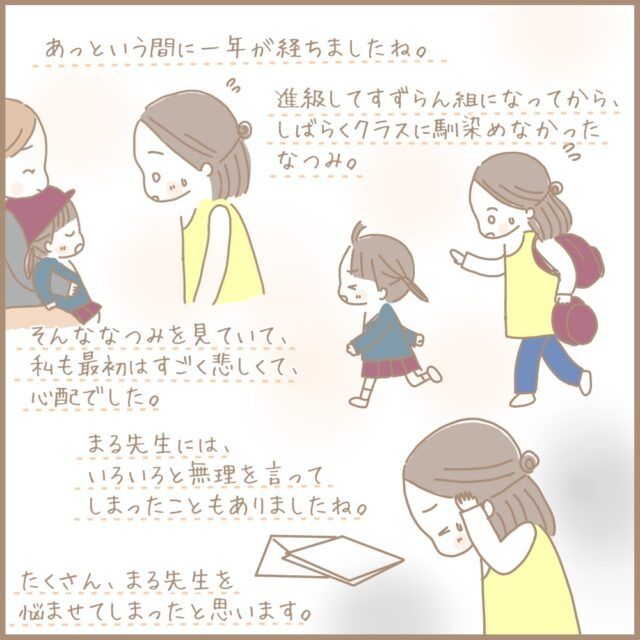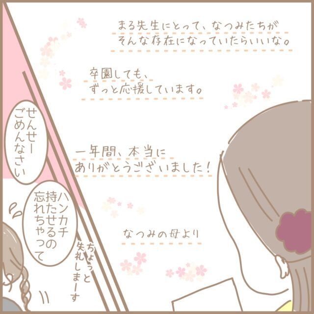 なつみちゃんが本当にすずらん組やまるちゃん先生のことが大好きで、楽しく通っていたのだなと伝わりますね。でも・・・まるちゃん先生、卒園式直前ですよー(汗)