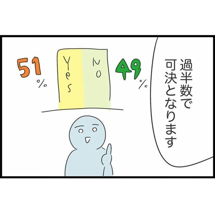話し合いで結論は出ないと感じた佐藤さん。理事長にどうやって決めるのかと問うと住民に賛成か反対かを聞き、多数決で決めると言われます。委任状も使い、全住民の意見で決まった結果であれば、どちらになっても納得できそうで安心ですよね。その場で意見を求められた佐藤さんですが、目の前の灰田さんに気を使い「もう少し考えたい」とこの場で賛成を表明することはやめることに。空気を読んだ佐藤さんの判断はとても賢明に思えますね。