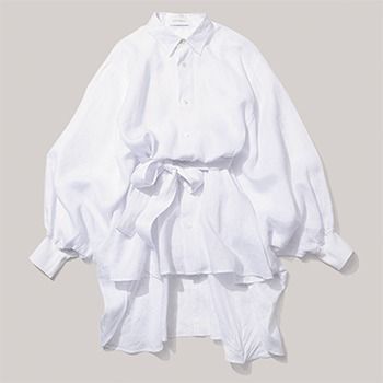 白シャツ/スタンブリー(ヒューエルミュージアム) 長くゆったりとしたシルエットを、ドルマンスリーブでいっそうエレガントに。ヒップを隠しつつ、脚を長く見せてくれる前後差をつけた丈感。共布のベルトをキュッと絞れば腰位置も高く見えてスタイル良く。