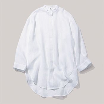 動作をじゃませず、着方のアレンジをスムーズに行える、柔軟性の高い透け感のある白シャツは、スタイリングを円滑にまわす救世主。やわらかなムードを保つため、ノーカラーや小ぶりなえりでかた苦しさは極力おさえて。
