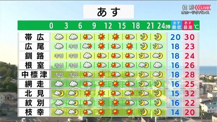 背景は15日(月)午後5時20分ごろの紋別情報カメラ。オホーツク海側はあすも日ざしに恵まれます。