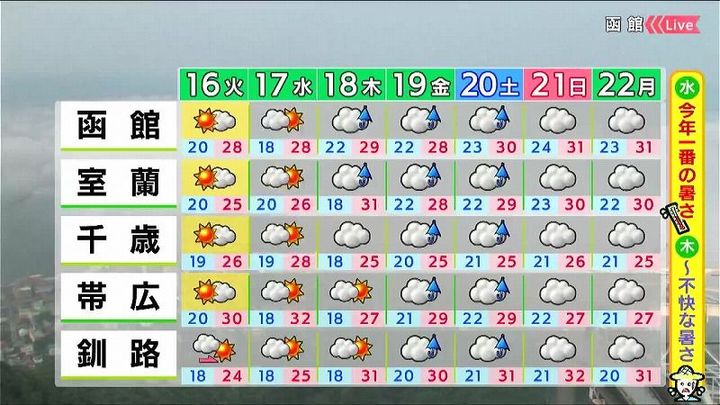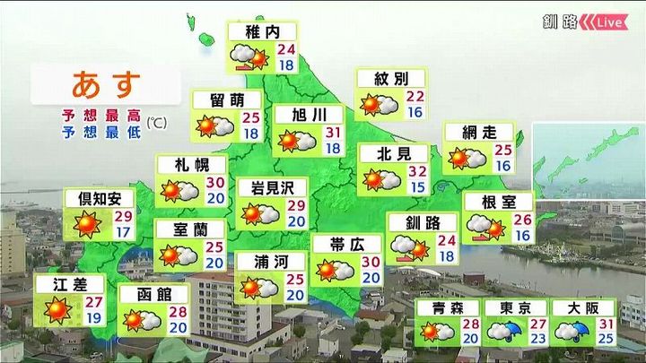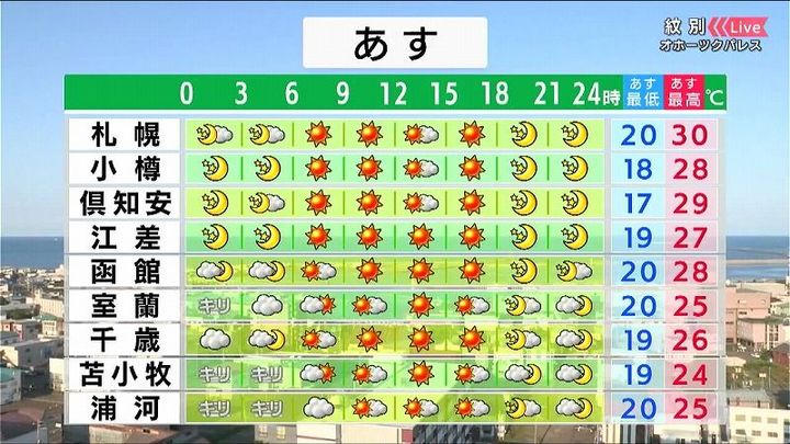 札幌など朝から日差しギラギラです。苫小牧や浦河は、朝は霧に注意してください。最高気温は海岸部でも25度以上の夏日。函館は28度でしょう。