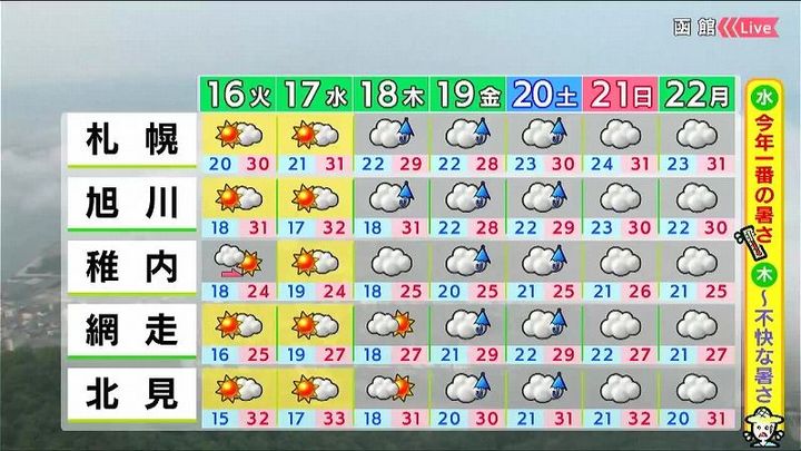 水曜も晴れて、旭川で今年一番の32度、北見は33度と厳しい暑さになります。