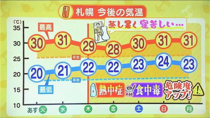 札幌の今後の予想気温を見てみましょう。連日、30度くらいまで上がって、夜も20度を下回らないんです。