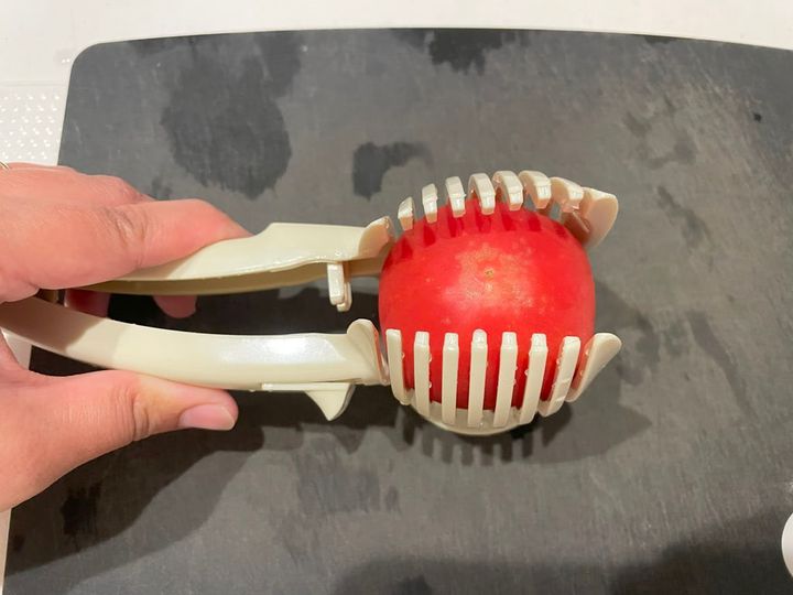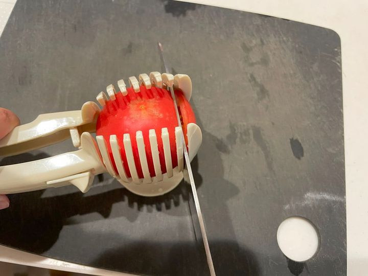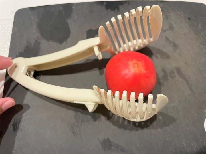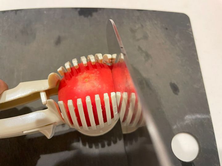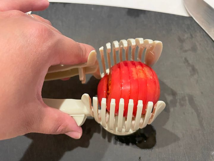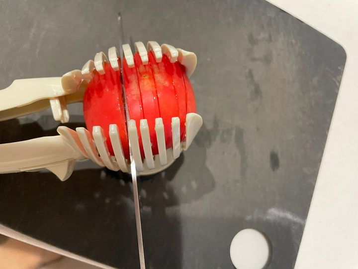 3. 【3COINS】まぁるい野菜や果物を“手早く均等にカット”できる!「スライスヘルパー」でトマトを切ってみた♪