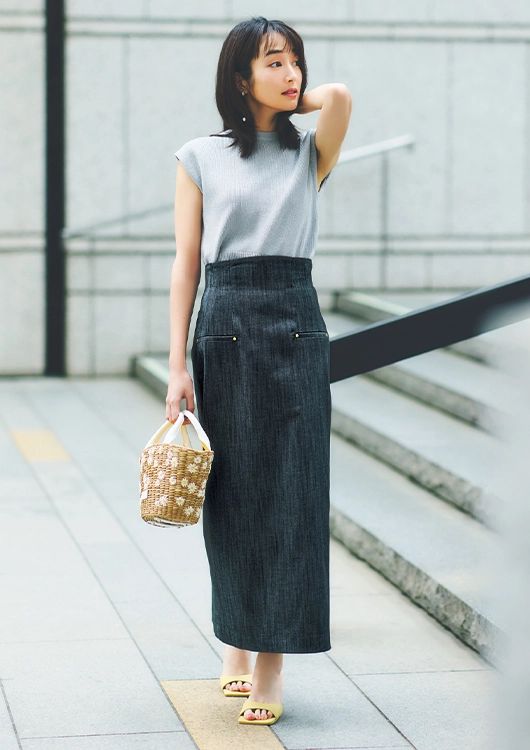 ノースリニット¥6,490/31 Sons de mode(ヒロタ) デニムタイトスカート(サスペンダー付き)¥18,700/アプワイザー・リッシェ イヤリング¥3,080/ハクフルール(ロードス) バッグ¥33,000/銀座かねまつ(銀座かねまつ6丁目本店) ミュール¥2,790/神戸レタス