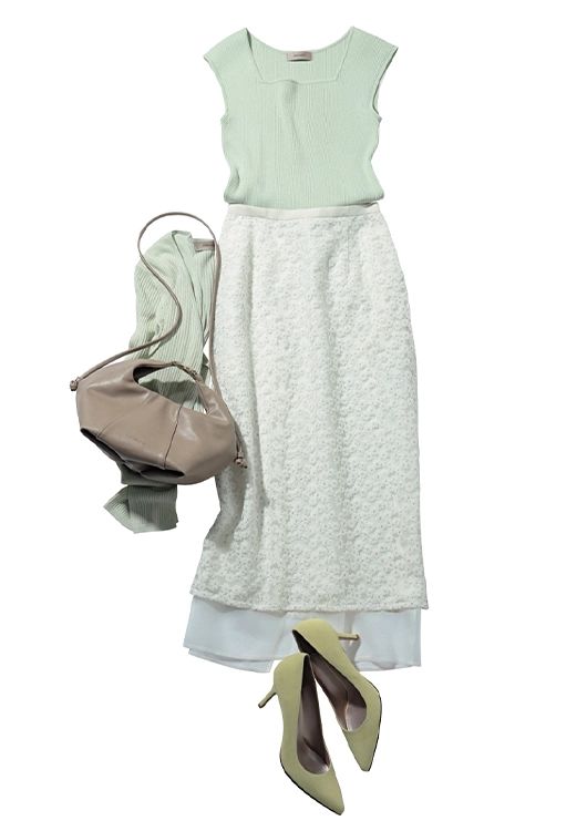 ノースリニット¥16,500/マイストラーダ タイトスカート¥21,890/ネイヴ(オンワード樫山) タンクトップ¥9,900/トラディショナル ウェザーウェア ルミネ有楽町店 イヤリング¥4,950/ジェンデンスター(ココシュニック新宿タカシマヤ店) バングル¥7,700/アビステ バッグ¥19,800/クリスチャン ヴィラ(ジネス/ジオン商事) パンプス¥23,100/ダイアナ(ダイアナ 銀座本店)