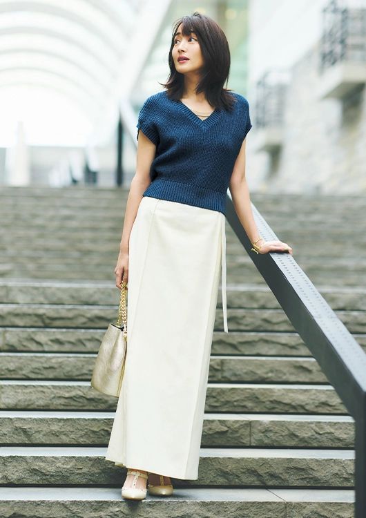抜け感のある女らしさを作る、ベストとペンシルスカートのコンビ