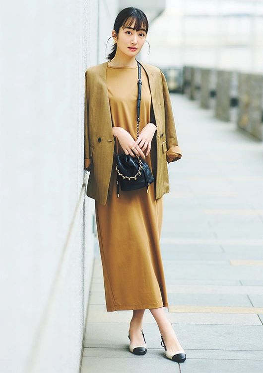 ジャケット¥53,900/アンタイトル ノースリワンピ¥16,500/IKITSUKE(IKITSUKE笹塚店) イヤリング¥3,630/プチタミ(ロードス) バングル¥11,000/マークスティールジュエリー(ココシュニック新宿タカシマヤ店) バッグ¥14,300、パンプス¥16,500/ともにダイアナ(ダイアナ 銀座本店)