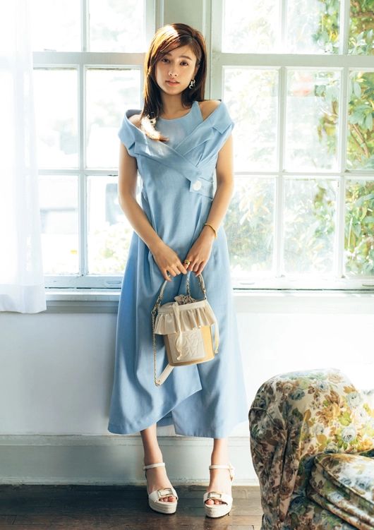 オフショルレイヤードワンピース¥23,980/SNIDEL ルミネ新宿2店 ピアス¥6,600、リング¥6,600、バングル¥6,050/以上ロニ バッグ¥12,100/31 Sons de mode(ヒロタ) サンダル¥12,650/ノエラ