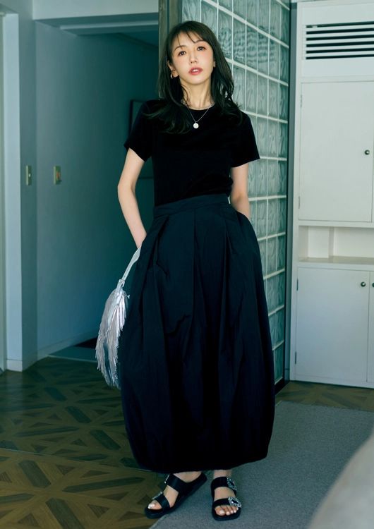 媚びずに女っぽい、ベーシックな黒Tを軸にしたブラックスタイル。色が落ち着いている分、フォルムや小物使いで私らしさをプラス。一目置かれるしゃれたオーラをまとって。