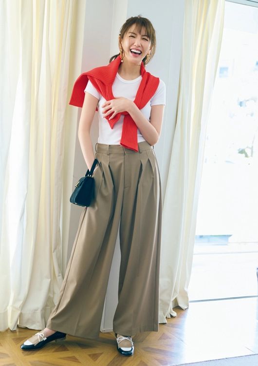 白Tに赤リブニットを効かせて遠くからでも目を引く存在感を発揮