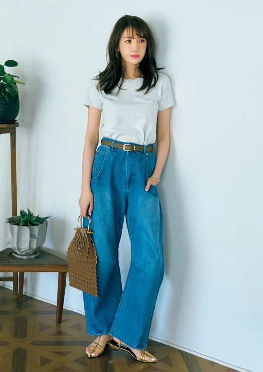 Tシャツ¥1,463/ユナイテッドアスレ(キャブ) デニムパンツ¥11,000/ラベルエチュード ピアス¥4,950/MEX、ネックレス¥2,980/ヘンカ、バングル¥6,930/ポピー・ケー(以上ロードス) ベルト¥990/GUバッグ¥35,200/メアリ オル ターナ(AL Design Inc.) サンダル¥14,850/ダイアナ(ダイアナ 銀座本店)