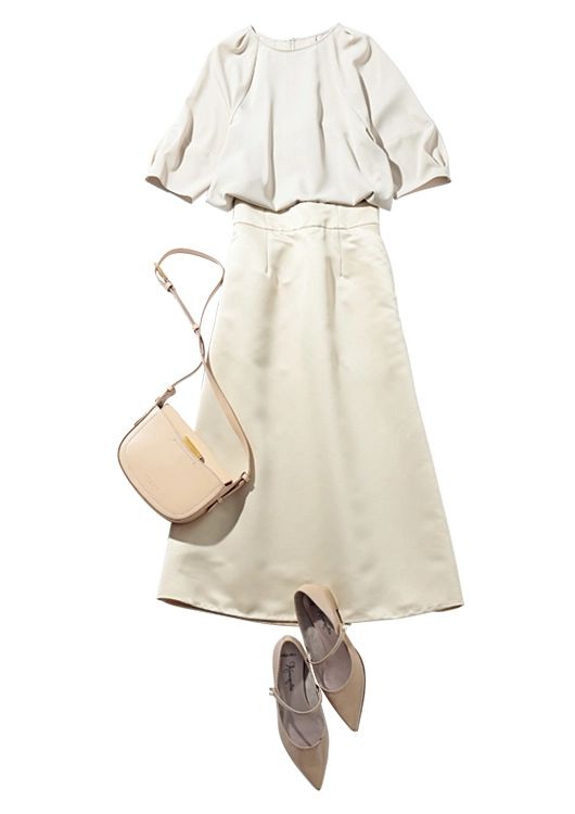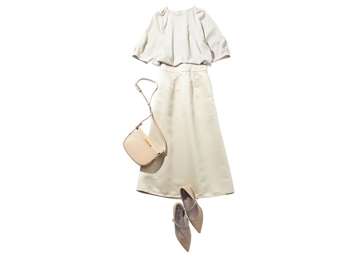 オフィスに馴染むワンツーコーデはベージュトーンでまとめれば優しい雰囲気に。スカートはフレアのラインがきれいに出て、シンプルコーデでも印象はエレガント。小物まできれいめで統一を。