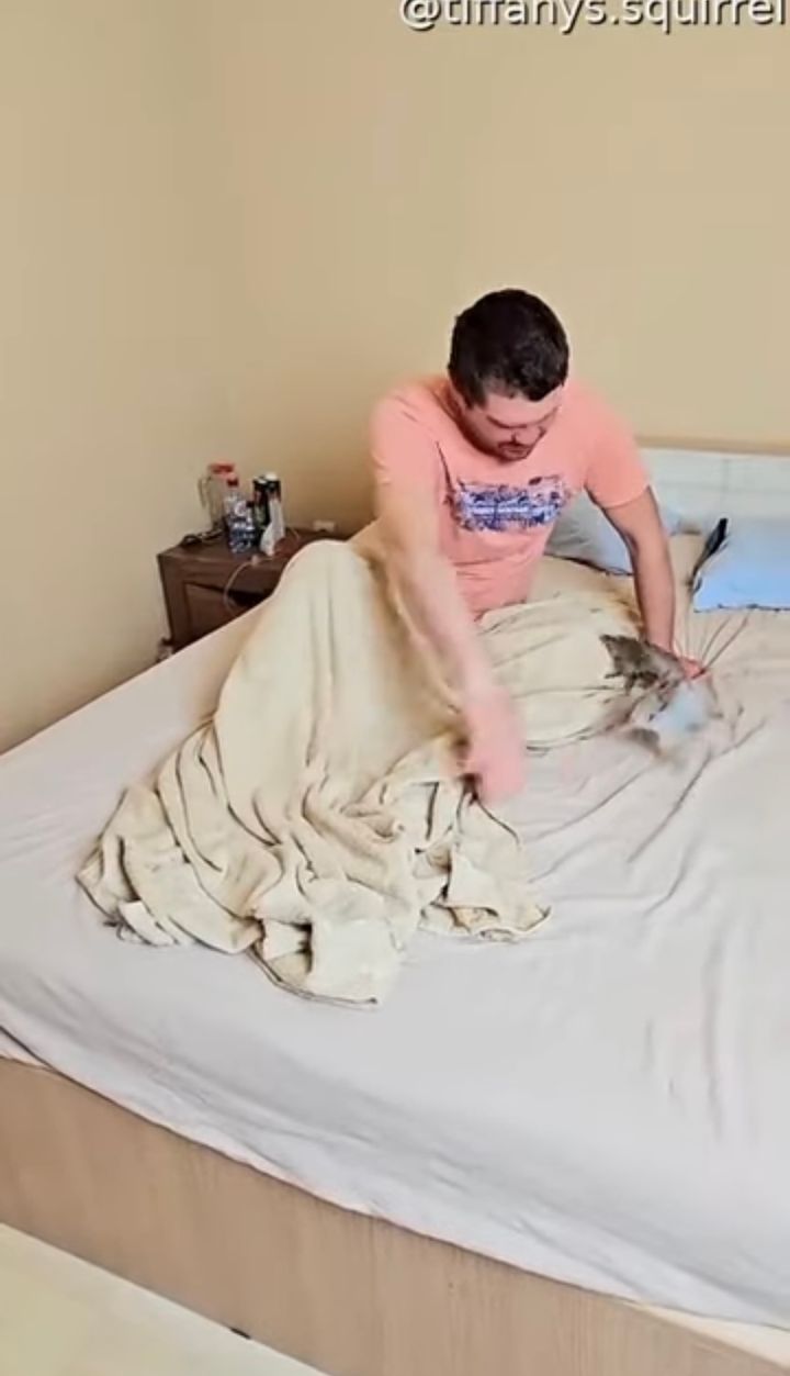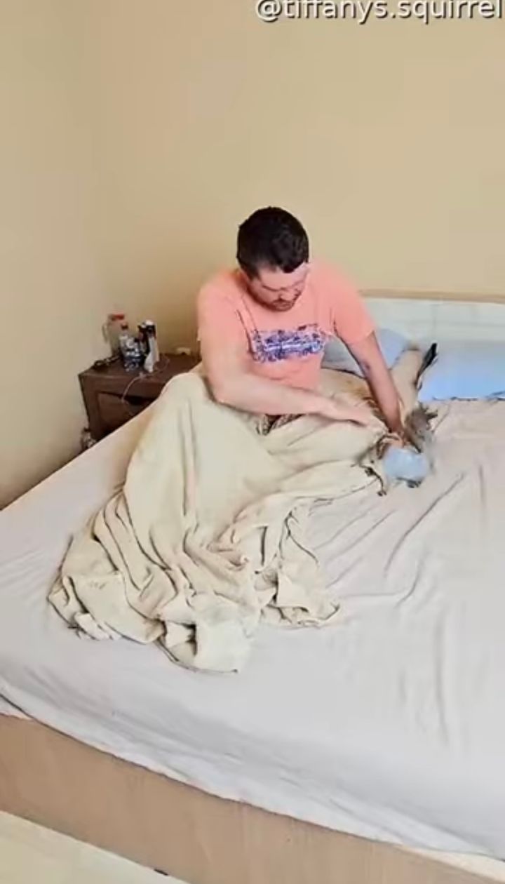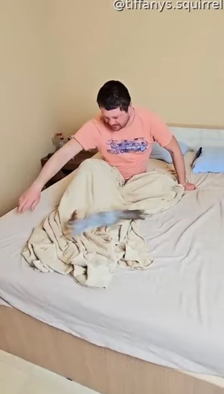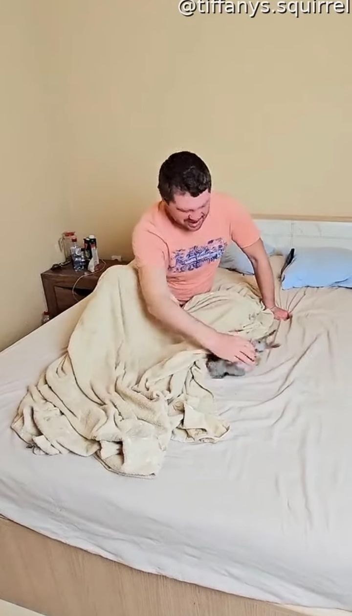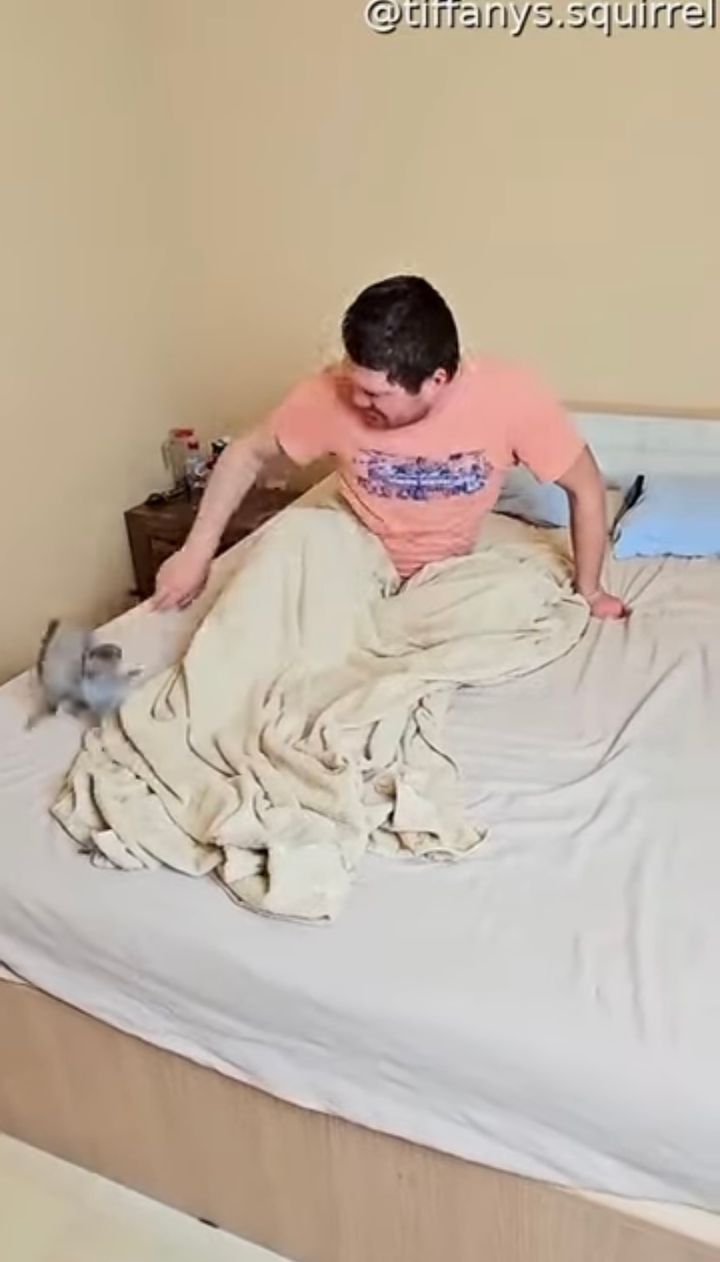 ベッドの上をグルグル走り回るリス。 夢中で男性の手を追いかける姿が愛らしく、微笑ましい光景です。
