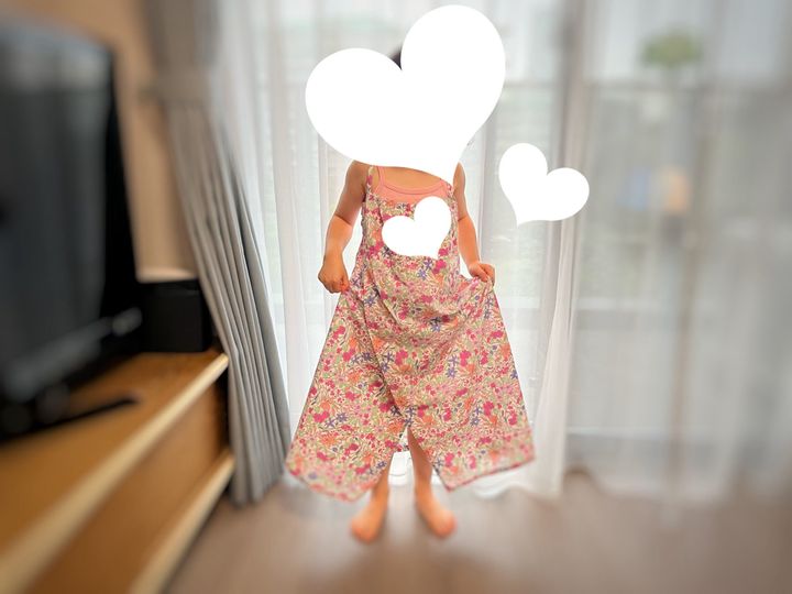 ワンピースタイプでスリット(?)が上部から入っていて動きやすそう、そして何より着せやすそう(親目線)、花柄が気に入った(ムスメ)という理由だけで選びました。Amazonでポチリです。