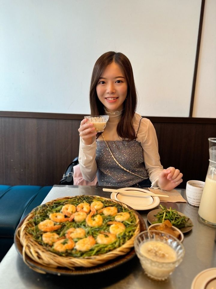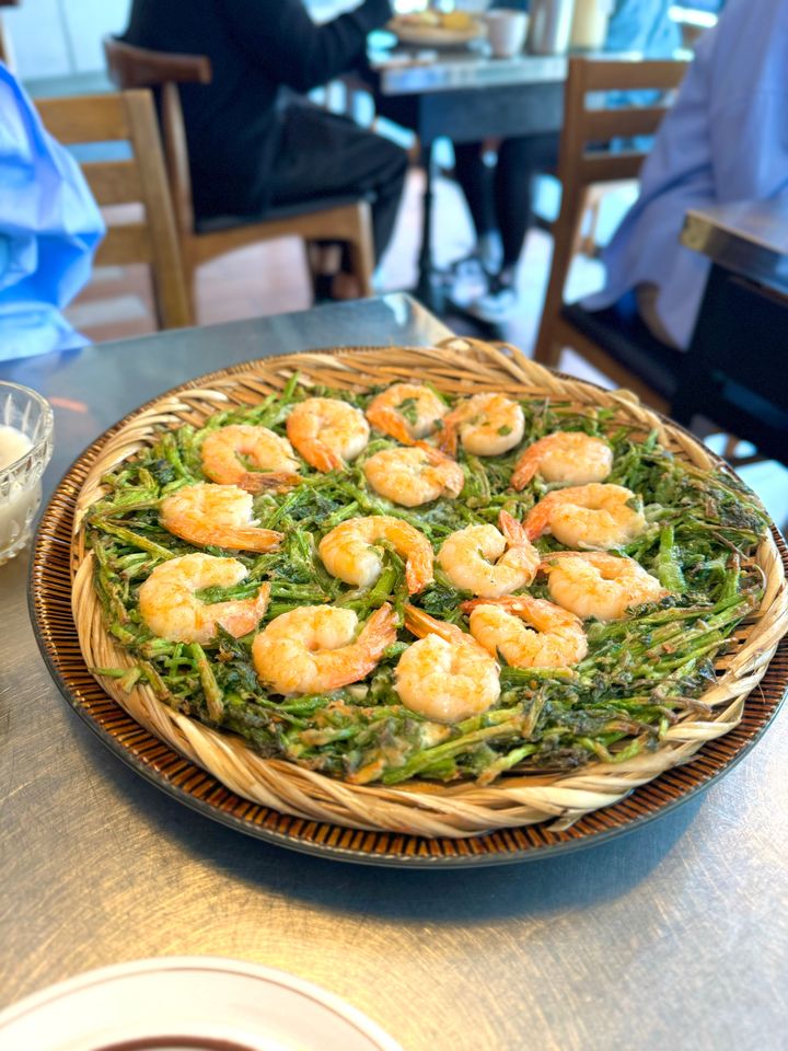 はちみつマッコリと一緒に頼んで欲しいのは、えびがたっぷり乗ったセリチヂミ🦐