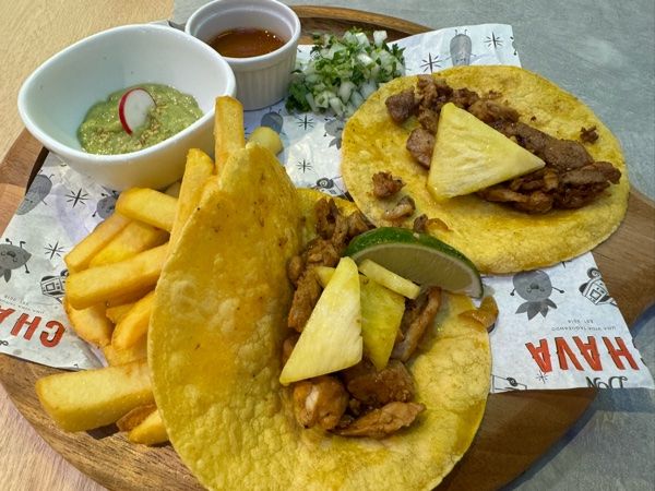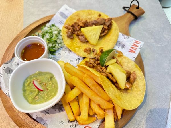具材のお肉のサイズはボリューム感があり、パイナップルとの相性も良く、ソースのピリ辛な味に玉ねぎ、パクチーが良いアクセントになっています。トルティーヤ(タコスの皮)はトウモロコシの程よい風味と甘味が感じられます。ワカモレ(アボカドのソース)も店内作りたてでフレッシュな味です。フライドポテトのディップソースとしても愉しめます。
