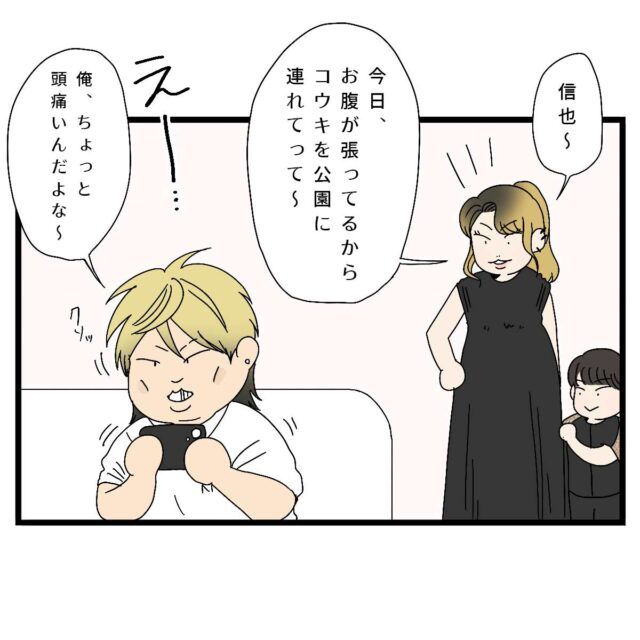 「信也~。今日、お腹が張ってるからコウキを公園に連れてって~」
