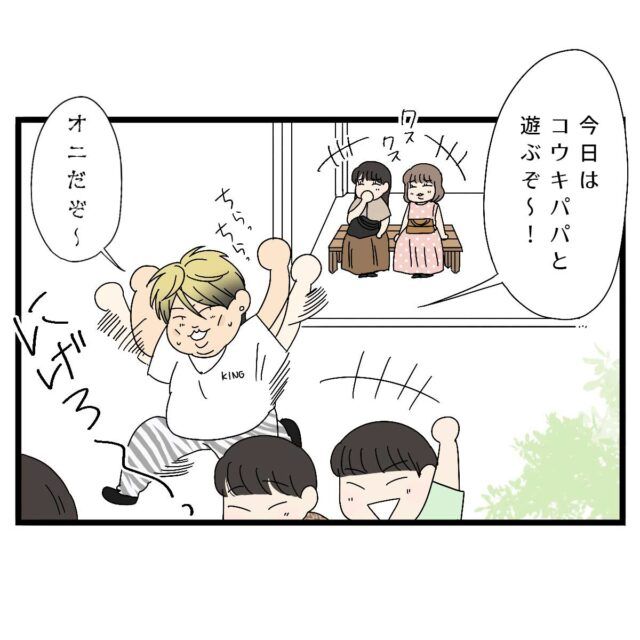 信也さんは子ども達3人の遊び相手を一手に引き受け、鬼ごっこを始めました。