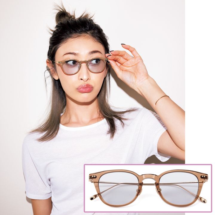 クリアなグレージュのフレームは肌なじみが良く主張しすぎないので、服を選ばず垢抜け感もプラス。おでこを出すと重くならず相性◎。[HESTER]¥44,000(プロポ/プロポデザイン)