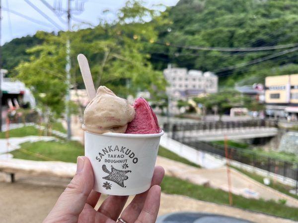 私もコチラのベンチをお借りして、以前ドーナツの記事を書かせていただいた高尾さんかく堂さんのジェラートを頂きました。とっても美味しそうだったので、夏になったら食べようと思っていたんですよね♪