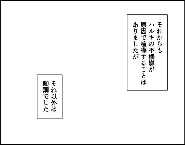 ハルキが不機嫌になってしまうこと以外はぶつかることもなく、仲良く過ごしていた2人。でも、一緒に過ごしていると、どちらかが何かを間違えたり行き違いがあったりするものです。それも、ハルキにとっては不機嫌発動のきっかけになってしまうようで…。