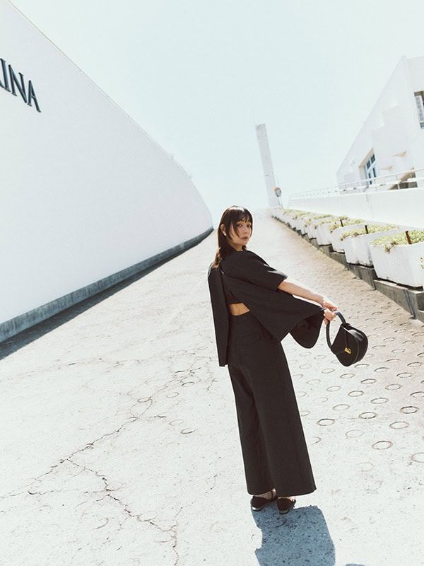 ジャケット¥19,800、パンツ¥18,700(共にエミ/エミ ニュウマン新宿店)、インナーブラトップ¥23,100(アーキタイプ/ユナイテッドアローズ 六本木ヒルズ店)、ピアス¥22,000(カラ・ユ/ショールーム ロイト)、バッグ¥41,800(ブレディ/ビショップ)、シューズ¥10,450(ラウナレア/ウフ) ☑ウォッシャブル ☑UVカット ☑速乾性 ☑接触冷感