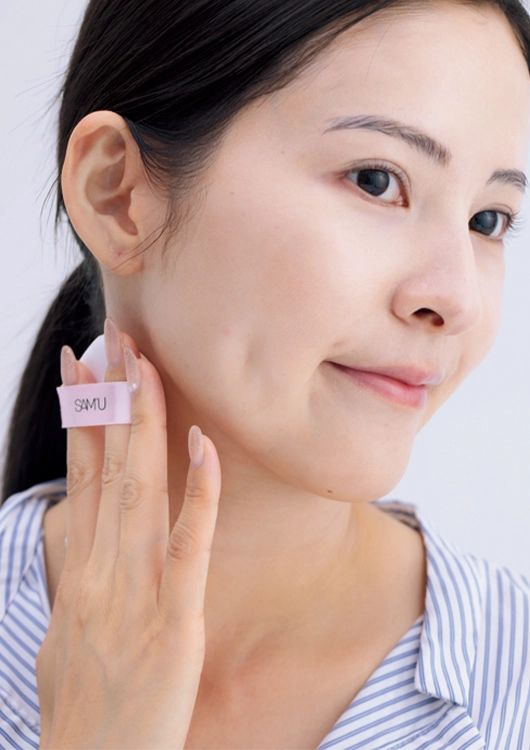 目元や頬骨など、陰影の強い部分はグリーンのベースでなだらかに。ファンデは顔だけでなく、首まで塗ると質感が均一になり、肌トーンがグンとアップ。顔だけ浮くのも防げます。このとき使うファンデは韓国コスメがオススメ。一瞬で白く明るく、今っぽい肌質になれます。