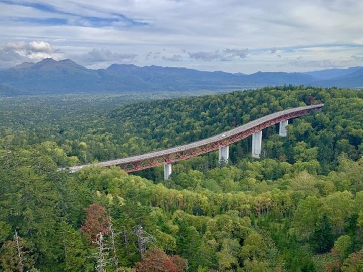 大雪山国立公園を走る国道273号線の峠。広大な原生林に架かる松見大橋は絶景。