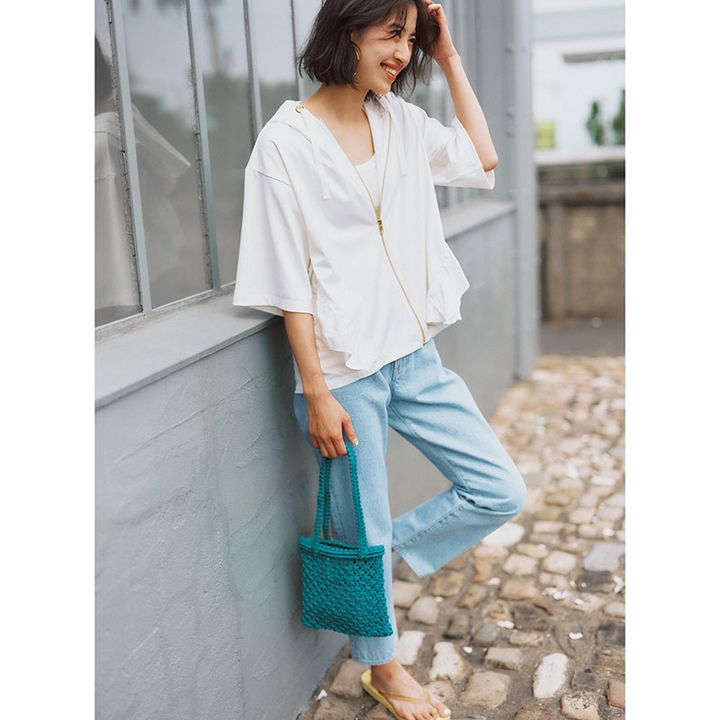 パーカ¥14,300(エマテイラー/STYLEDOOR)タンクトップ¥9,900(Sov./フィルム)デニムパンツ¥16,940(アンクレイヴスタンダード/オンワード樫山)ピアス¥66,000(モニス/フォーティーンショールーム)バッグ¥8,800(ケッシュル エッセンシャル)サンダル¥2,750(イパネマ/シードコーポレーション)